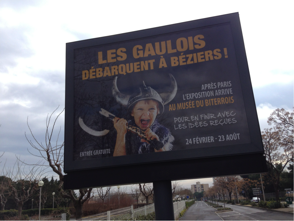 Lorsque l’on pénètre ces semaines-ci dans la ville de Béziers, d’énormes panneaux annoncent en grosses majuscules fluo : « LES GAULOIS DÉBARQUENT À BEZIERS ! ». Sur l’affiche au fond noir, un garçonnet blond aux yeux bleus, en gros plan, coiffé d’un casque à corne trop grand et vêtu d’une peau de bête, semble se précipiter vers le spectateur avec une féroce grimace, brandissant une énorme hache, ou plutôt une francisque de théâtre. Hasard, ces panneaux sont particulièrement abondants dans la périphérie de la ville, le long des mornes barres d’immeubles qui abritent, si l’on peut dire, de nombreuses familles issues de l’immigration. Un sous-titre précise : « pour en finir avec les idées reçues ».